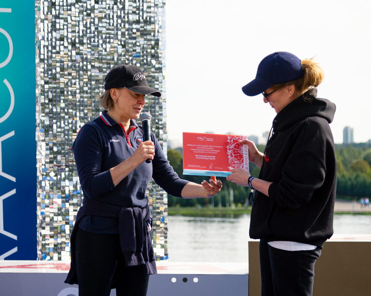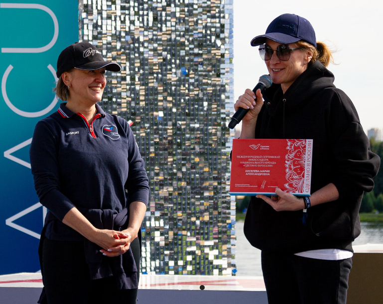 Three-time Olympic synchronized swimming champion and TV presenter Maria Kiseleva has joined the ambassadors for the Made in Russia national brand. Veronika Nikishina, General Director of Russian Export Center (REC, VEB Group), presented her with a certificate confirming this status on September 14 at the Rowing Canal in Moscow.