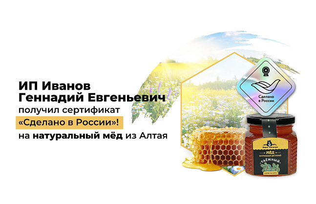 Пчеловодческое хозяйство ИП Иванова Геннадия Евгеньевича из села Тогул Тогульского района Алтайского края стало обладателем сертификата национального бренда «Сделано в России» по направлению «Органическое происхождение»